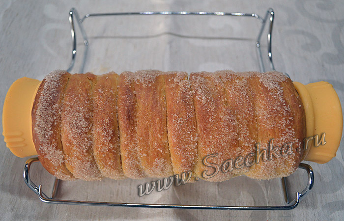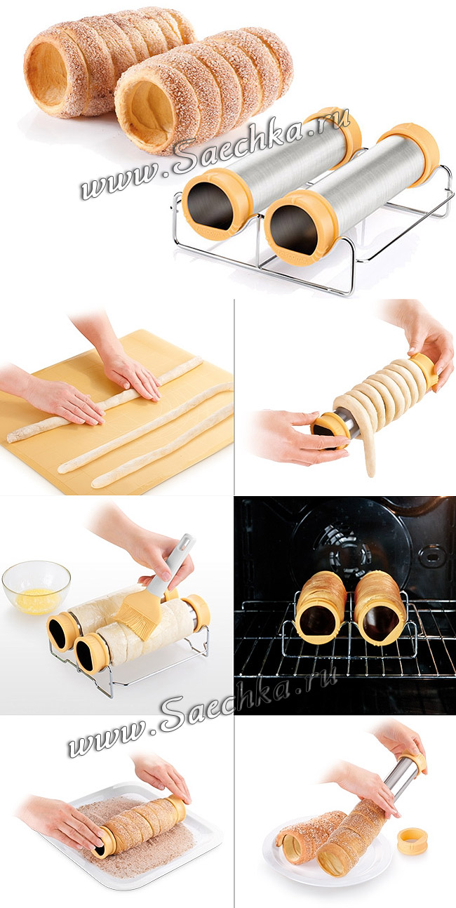 - Раскатать тесто в жгутики, нанизать на цилиндры и смазать взбитым белком. Обвалять в смеси сахара, корицы или орехов (можно обваливать горячими сразу после выпечки). Вот фотография с сайта производителя: