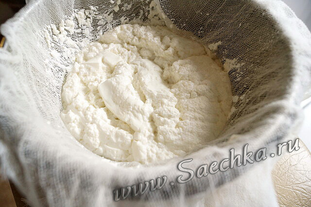 - Я так долго не ждала: домашний творог тёплым откинула на сито с марлей.