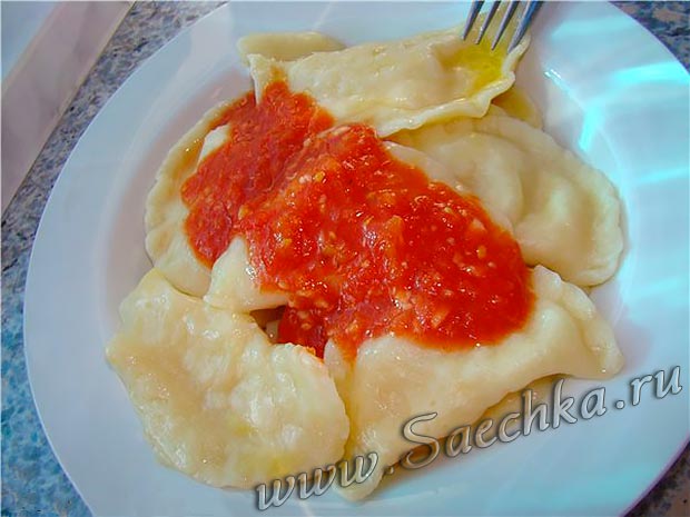 Домашние вареники приготовлены с картофельным пюре и луком, а подавались с помидорным соусом. Вкусно!