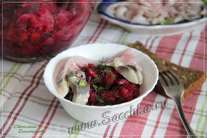 Овощной салат - винегрет - подала к столу с сельдью и маринованным луком. Это очень вкусно!