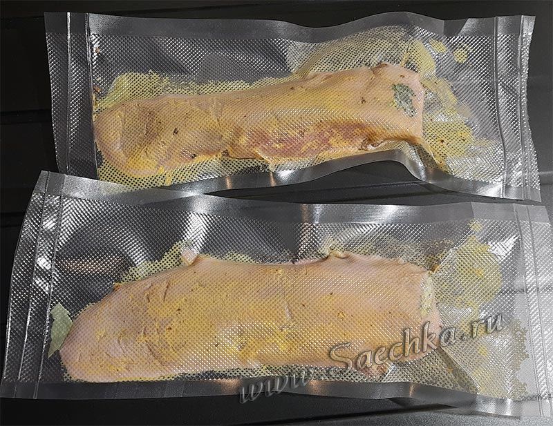 - Далее можно положить в холодильник на несколько часов для маринования, либо сразу отправить в мультиварку (у меня Steba). Режим «Подогрев» при 70 градусах С на 6 часов (предварительно налить воду в чашу мультиварки, чтобы покрывало вакуумированный пакет).