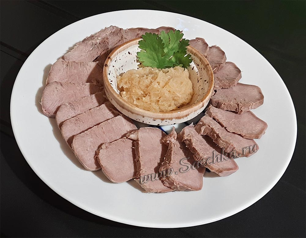 - Свиной язык вымыть, обмазать смесью горчицы, чеснока, перца и соли. Вакуумировать.