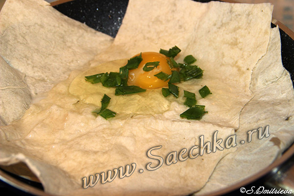 - В середину разбила яйцо, посыпала зелёным луком, поперчила и посолила.