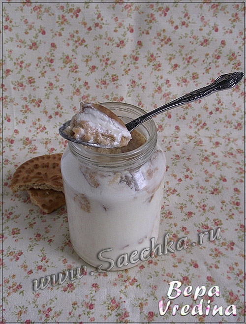 - В баночки положить кусочки разломанного печенья, залить молочной смесью.