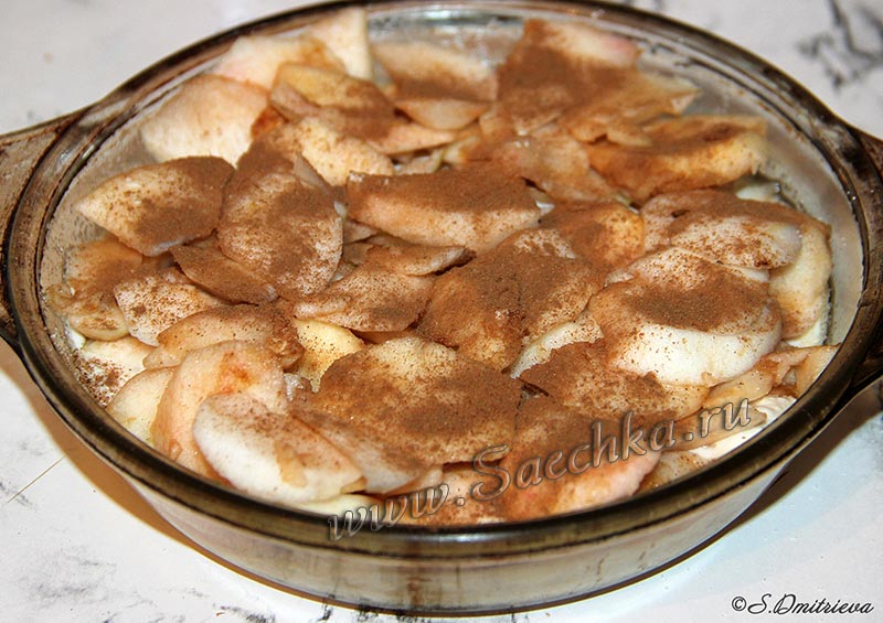 - Далее я выкладываю очищенные и нарезанные некрупными кусочками яблоки, посыпаю корицей и сбрызгиваю жидким сахарозаменителем, но его можно заменить обычным сахаром.