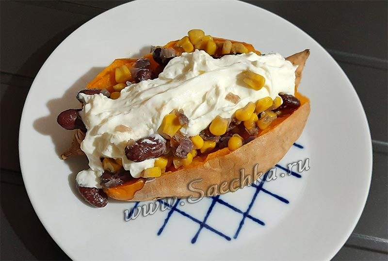 Запечённый в духовке батат приготовлен с фасолью, кукурузой и грибами.