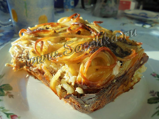 - Спагетти отварить до готовности и произвольно выложить в форму, смазанную маслом (большую часть спагетти).