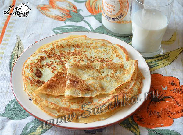 - Жарить тоненькие блины на раскаленной сухой сковороде с двух сторон до готовности.