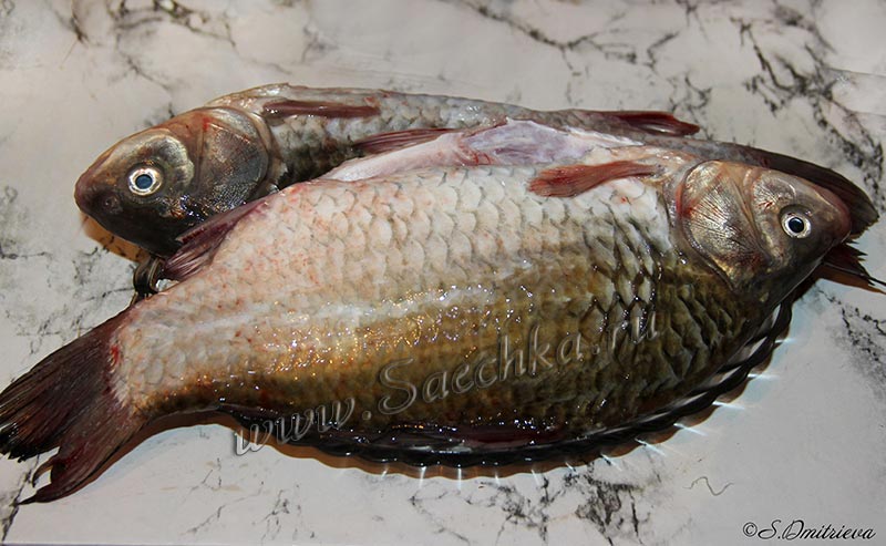Ну вот добралась я и до карасей! Брала на рынке, ещё трепыхающихся, поэтому вопрос свежести отпал сам собою. Но если что, надо смотреть на глаза: они не должны быть мутными, ну и жабры должны быть розовые, а не серые.