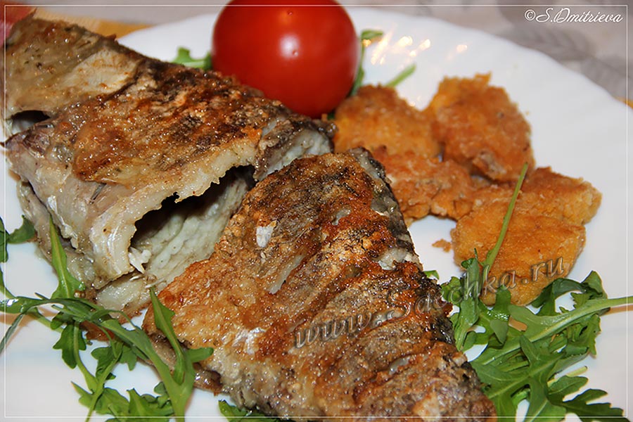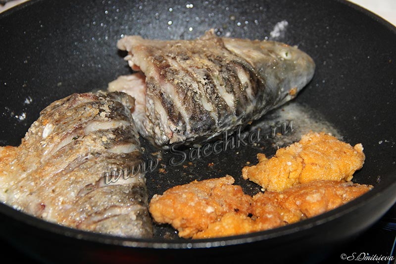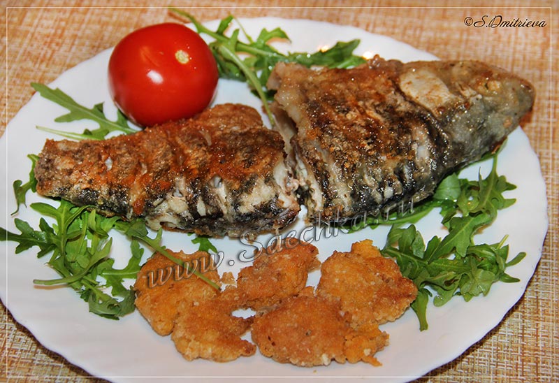 - Далее солим, перчим рыбу, обваливаем в кукурузном крахмале и жарим карася на сковородке на среднем огне, желательно на сливочном масле, но можно и на подсолнечным или на смеси этих масел.